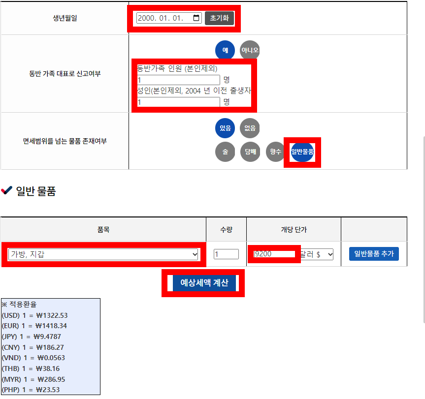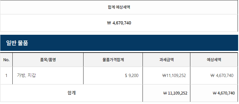 면세범위 초과물품 예상세액 조회